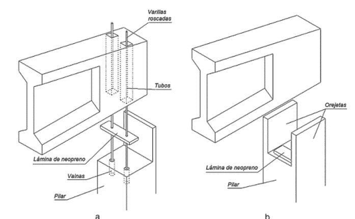 Apoyo de soporte recto. Se caracteriza por la disposición de barras corrugadas o varillas roscadas en los pilares, a modo de esperas, que se introducen en unos pasatubos que presentan las vigas y que se rellenan con mortero en el montaje. Para evitar el contacto directo de la viga con el pilar suelen disponerse láminas de neopreno, pero es habitual encontrar apoyos directos, «a hueso».